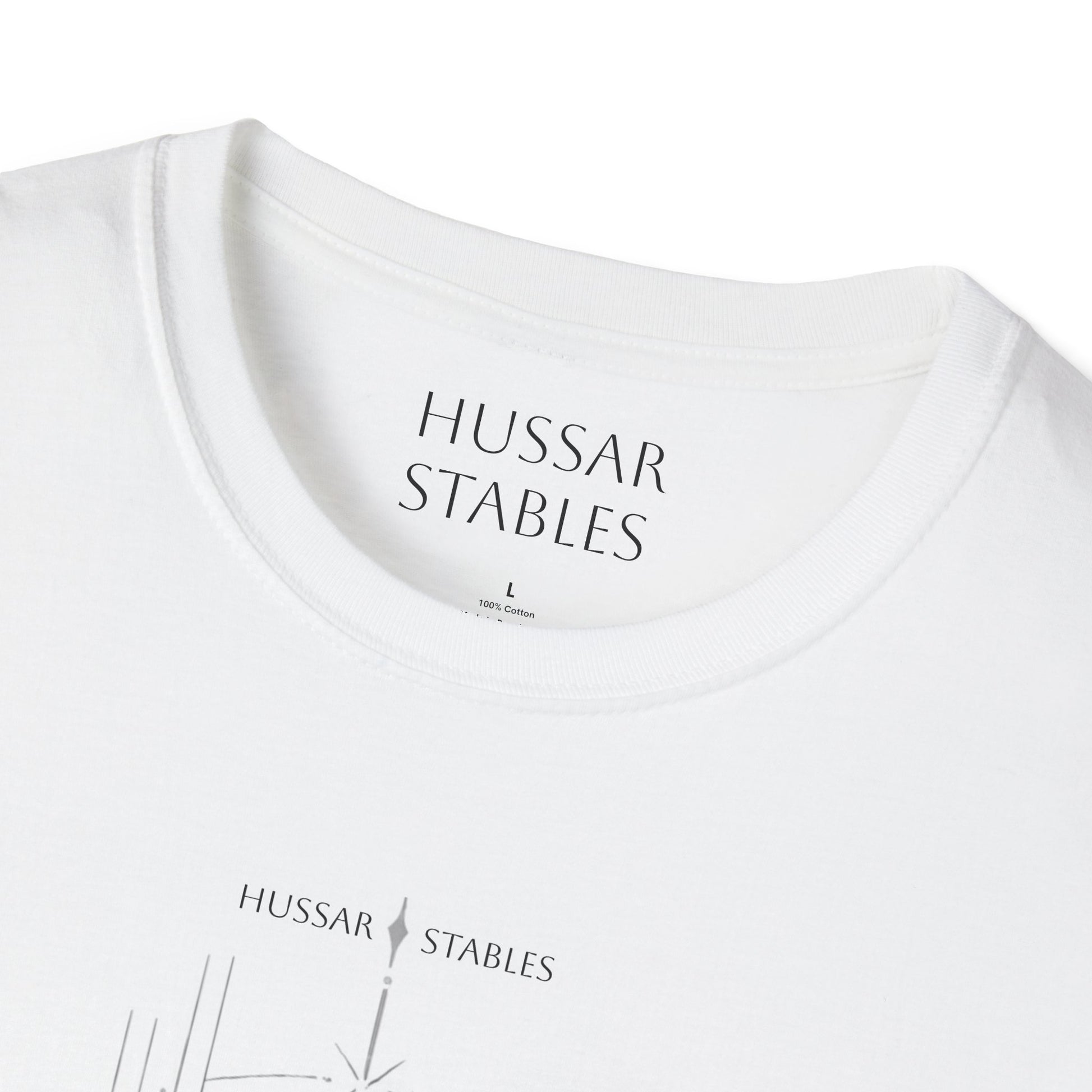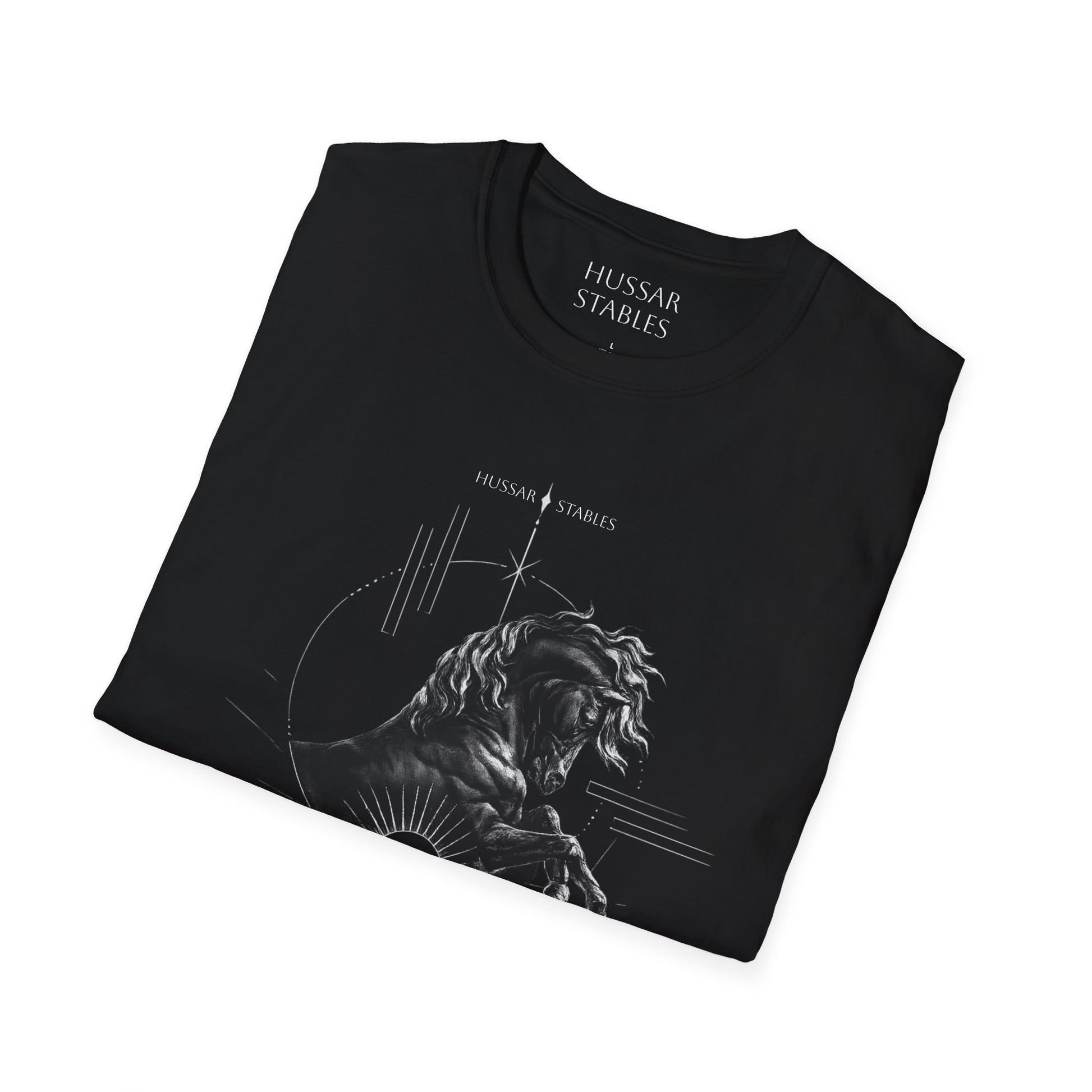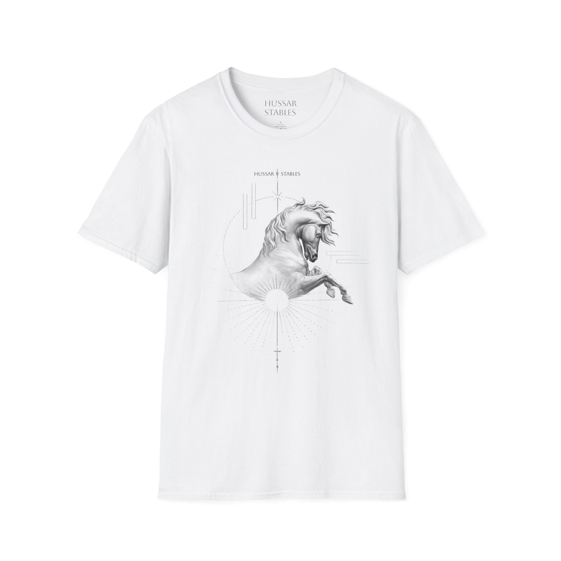 A soft, breathable cotton tee that carries a quiet, artful presence. The front features a finely detailed horse illustration rendered in delicate grayscale lines — a poised stallion mid-rear, surrounded by subtle geometric accents that give the image a modern, gallery-ready feel. Lightweight and smooth against the skin, this shirt slips into everyday life: worn layered under a jacket for city outings, paired with jeans for a relaxed morning at the barn, or kept simple for slow afternoons of sketching and coffee. The crew neck and classic fit keep the silhouette clean, while the tear-away label and stable shoulder tape make it comfortable hour after hour. This is for people who love animals and craftsmanship — those who want their clothing to whisper character, not shout it.