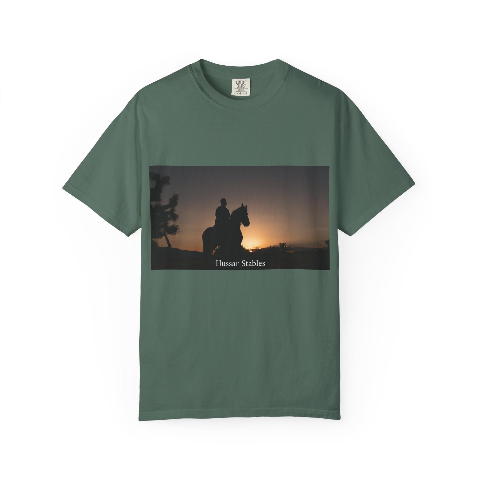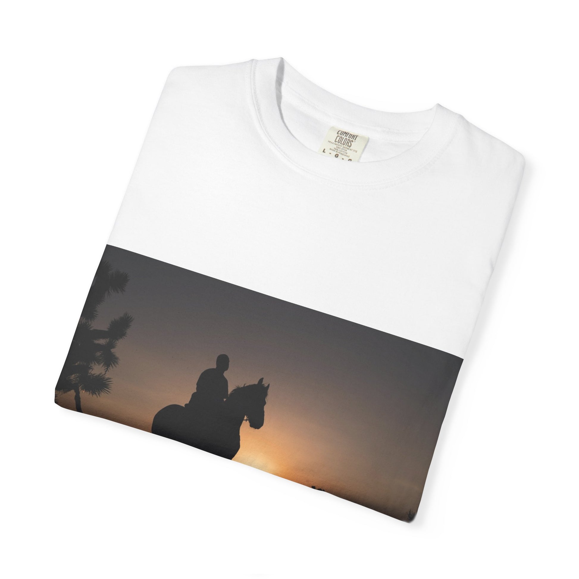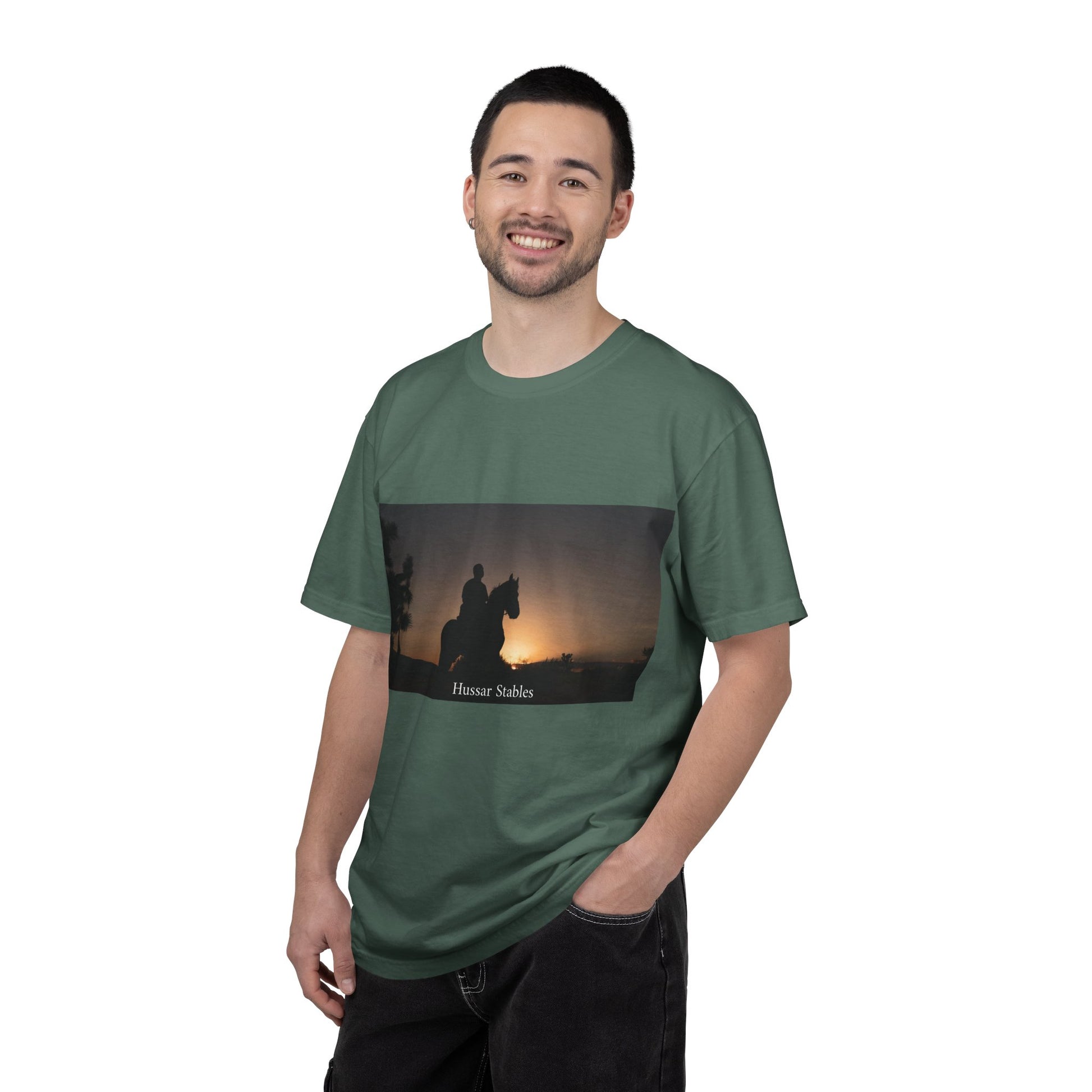 A relaxed, heavyweight tee that feels like an old favorite from the first wear. The garment-dyed cotton softens with time and carries a muted, lived-in color that lets the sunset silhouette artwork breathe. Picture a slow evening ride at golden hour — the quiet hum of hooves, the last light turning the world to bronze. This shirt slips into that moment: comfortable, worn-in, and quietly visual. It pairs with faded denim or riding boots, and layers easily under a flannel or jacket for chilly dusk rides.