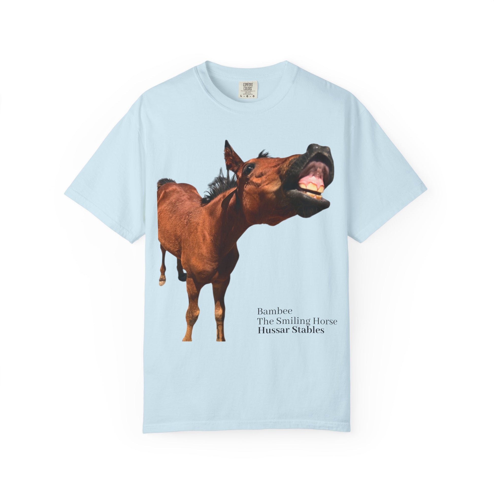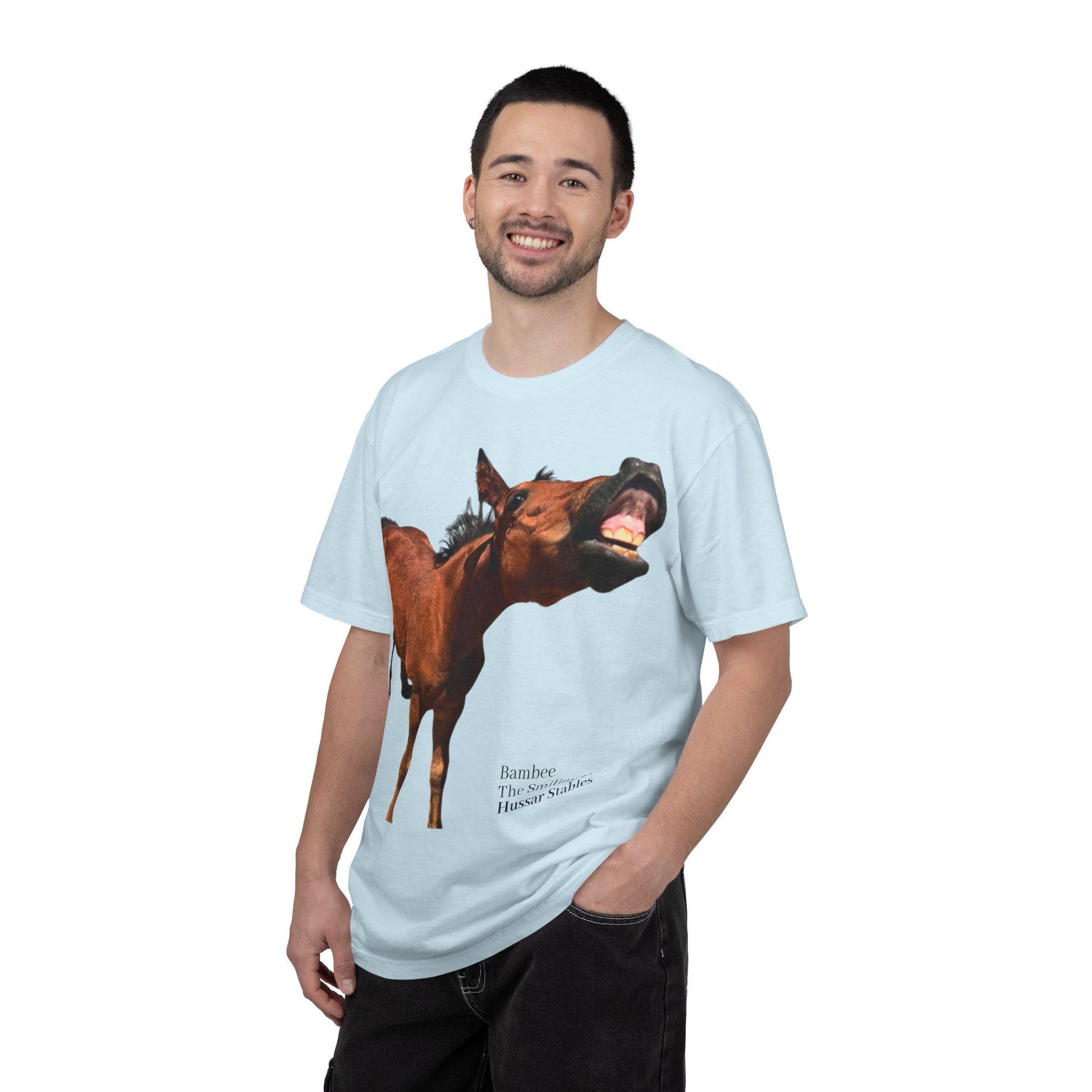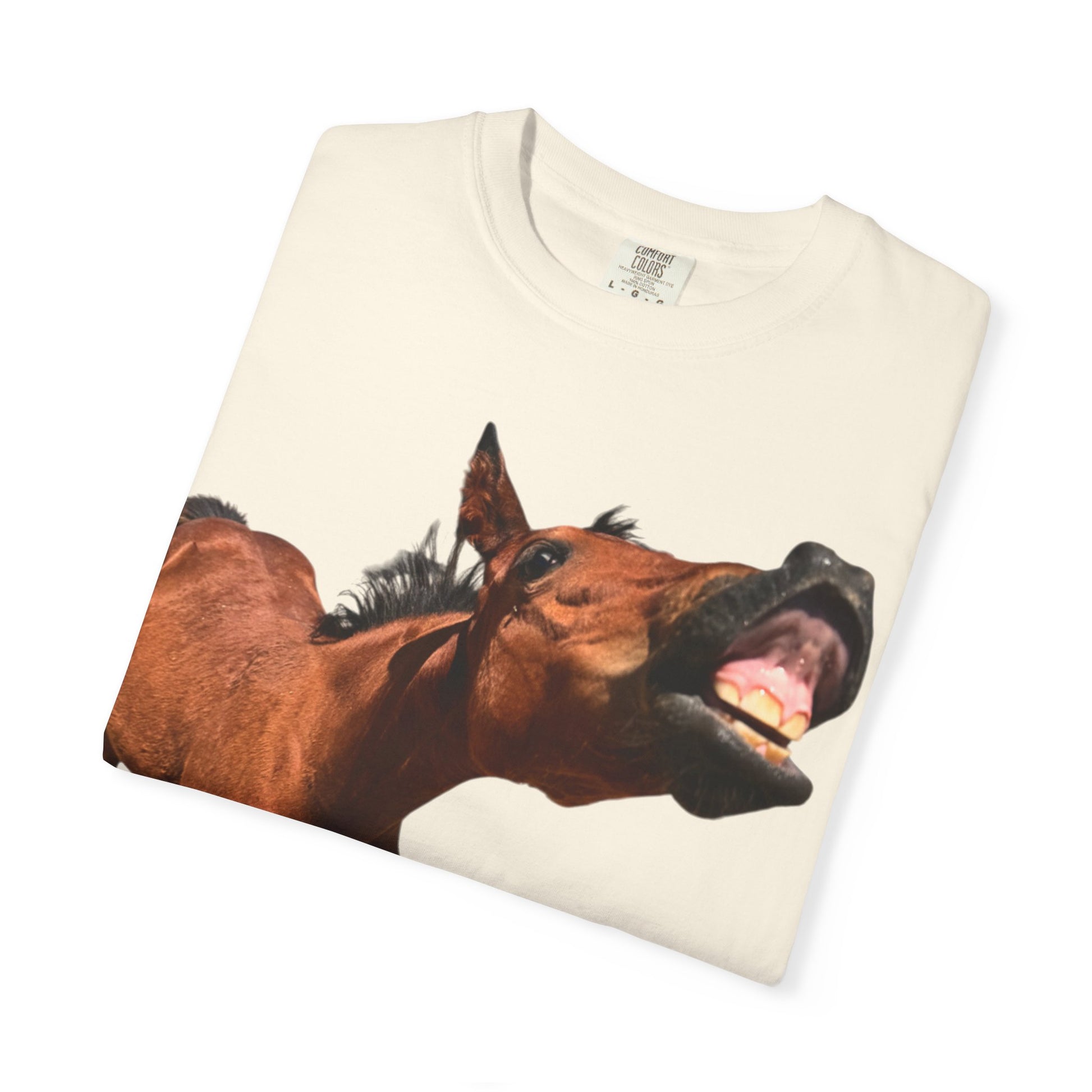 This heavyweight garment-dyed tee brings barnyard humor and authentic equestrian charm into everyday wear. The front features a large, full-color photo of a horse mid-grin — honest, goofy, and impossible to ignore — with a small, understated caption near the hem that reads like a plaque from a stable. The shirt’s soft, pre-shrunk 100% ring-spun cotton and garment-dyed finish give the fabric a lived-in feel that only gets better with time. Cut in a relaxed silhouette with durable double-needle stitching and a tubular knit that eliminates side seams, it sits comfortably during long mornings at the barn or slow afternoons on the porch. Available in a wide range of colors and sizes up to 4XL, this tee works as everyday farmwear or a conversation-starting casual layer for horse lovers, stable volunteers, and anyone who delights in rural humor and honest snapshots of animal life.