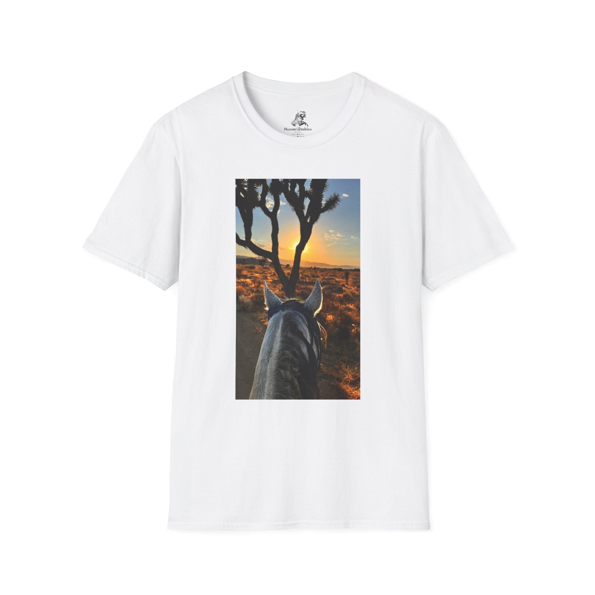 Ride into quiet, sunlit miles with this soft, breathable tee. The front print captures a rider’s view — the horse’s neck leading toward a warm sunset framed by gnarled trees — and pulls you right back to that slow, golden hour feeling. Lightweight ring-spun cotton sits close but comfortable, so the image stays vivid while you move. A small, understated logo on the upper back keeps the look clean and wearable every day, from barn chores to trailside coffee stops. The knit construction and ribbed collar hold shape through wash-and-repeat seasons, while the tear-away label keeps your neck irritation-free. This shirt wears like a memory: familiar, steady, and quietly adventurous.